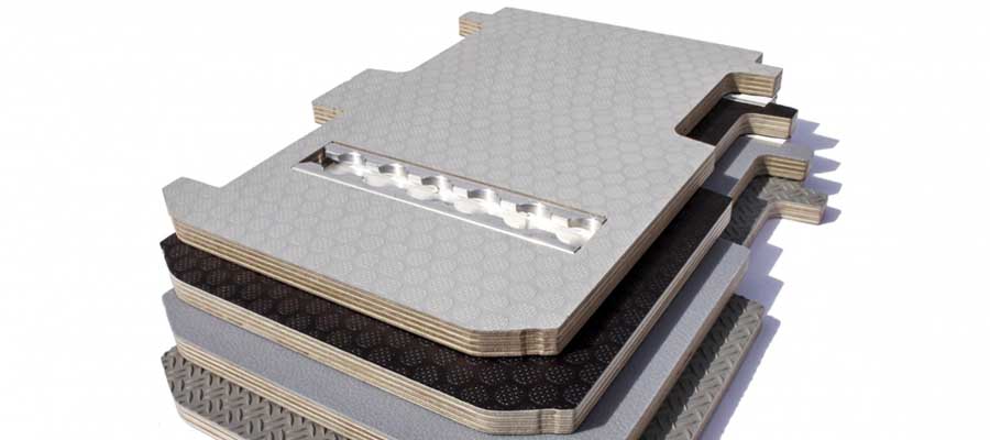 Fahrzeugboden aus strapazierfähigem Birkensperrholz hergestellt mit einer extrem belastungsfähigen, rutsch- und wasserfesten Oberfläche.